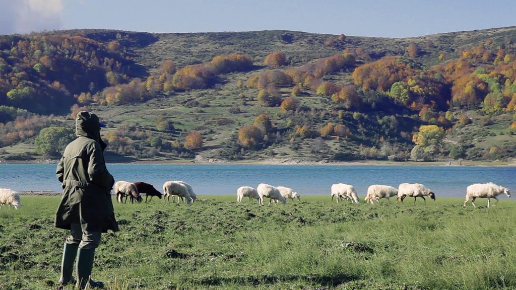 Berardino Perilli nei pressi del lago di Campotosto mentre accompagna le sue pecore al pascolo alla fine dell’estate.