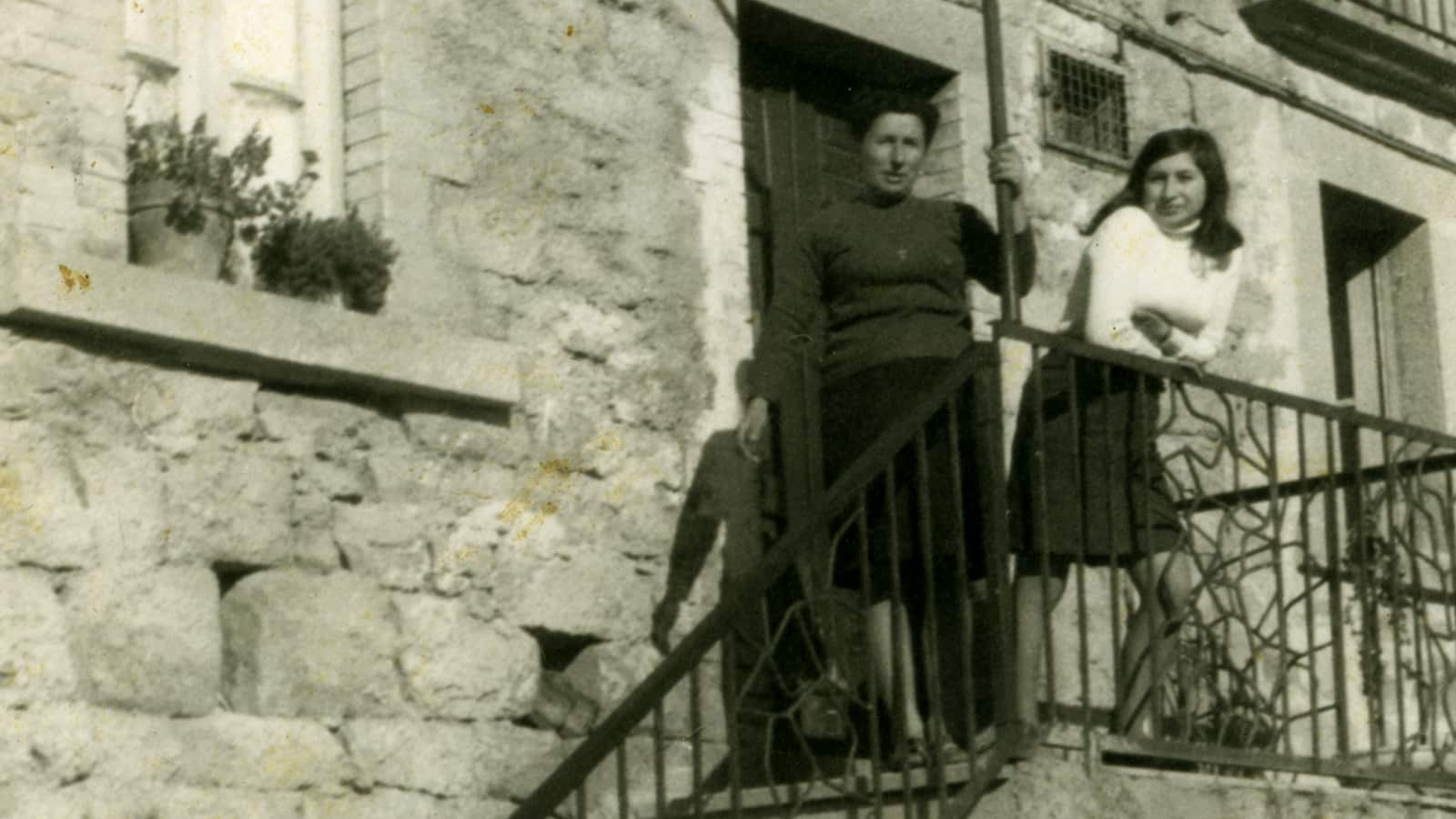 La cantrice Costanza Romani sul pianerottolo di casa assieme alla figlia Maria Santa.