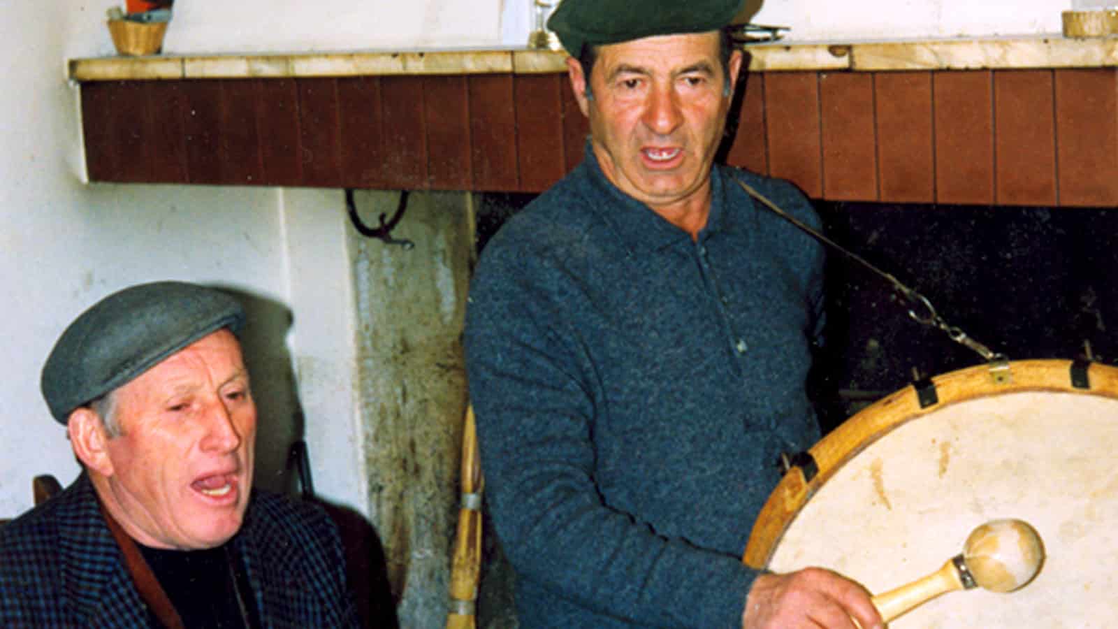 Antonio Trignani e Camerino De Flavis, componenti di una squadra di questua, durante il canto rituale per le case.