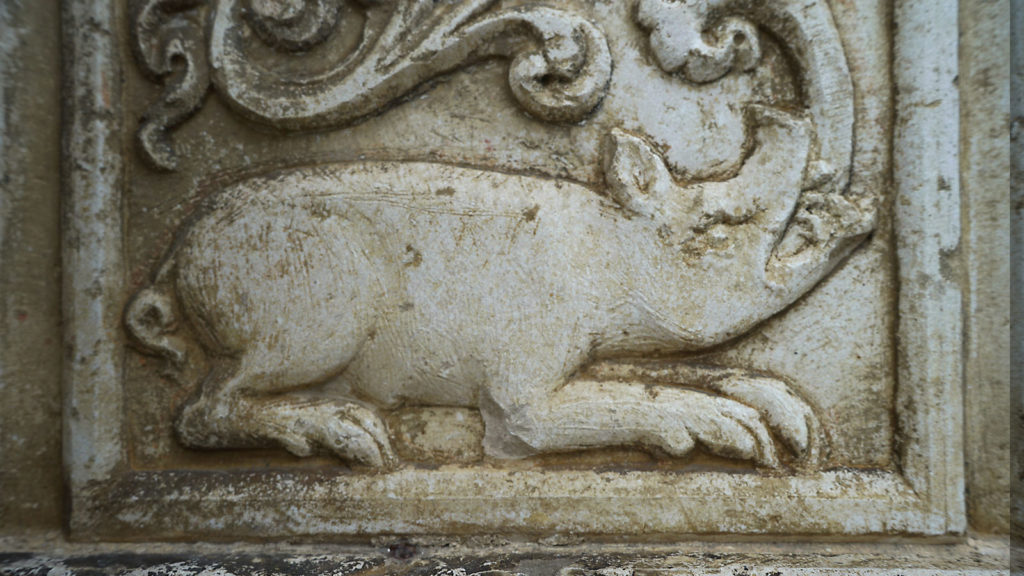 Particolare del suino in bassorilievo scolpito ai piedi del quattrocentesco portale della chiesa di Sant’Antonio abate.