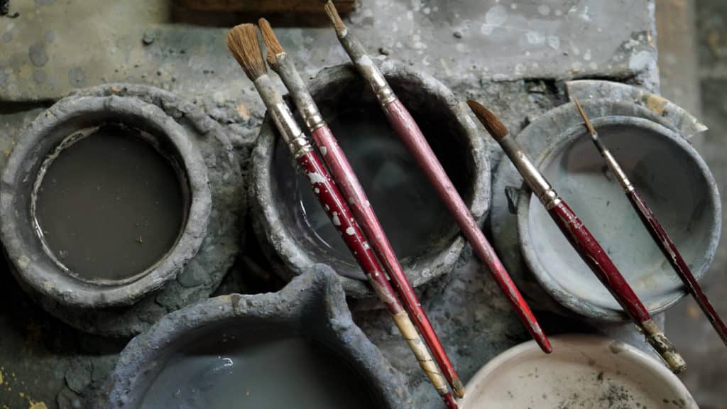 Una parte dei pennelli e dei colori utilizzati da Antonio Di Simone nella sua bottega.