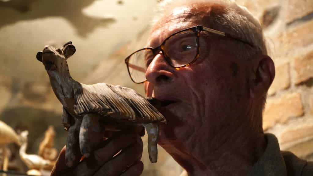 Vicino all’antico forno della sua bottega maiolicara, a fianco ai vecchi colori castellani e ai frammenti minerali da cui sono ricavati, una miriade di personaggi del presepe e di fischietti zoomorfi e antropomorfi popola la stanza delle meraviglie di Vincenzo Di Simone. Tra vetrine e calde luci soffuse, muovendosi tra i suoi oggetti come un sapiente demiurgo, l’artigiano soffia nel “becco” in terracotta di ogni figura dando vita, voce e respiro alle sue “creature”, mentre racconta la spinta immaginativa che le ha materializzate.